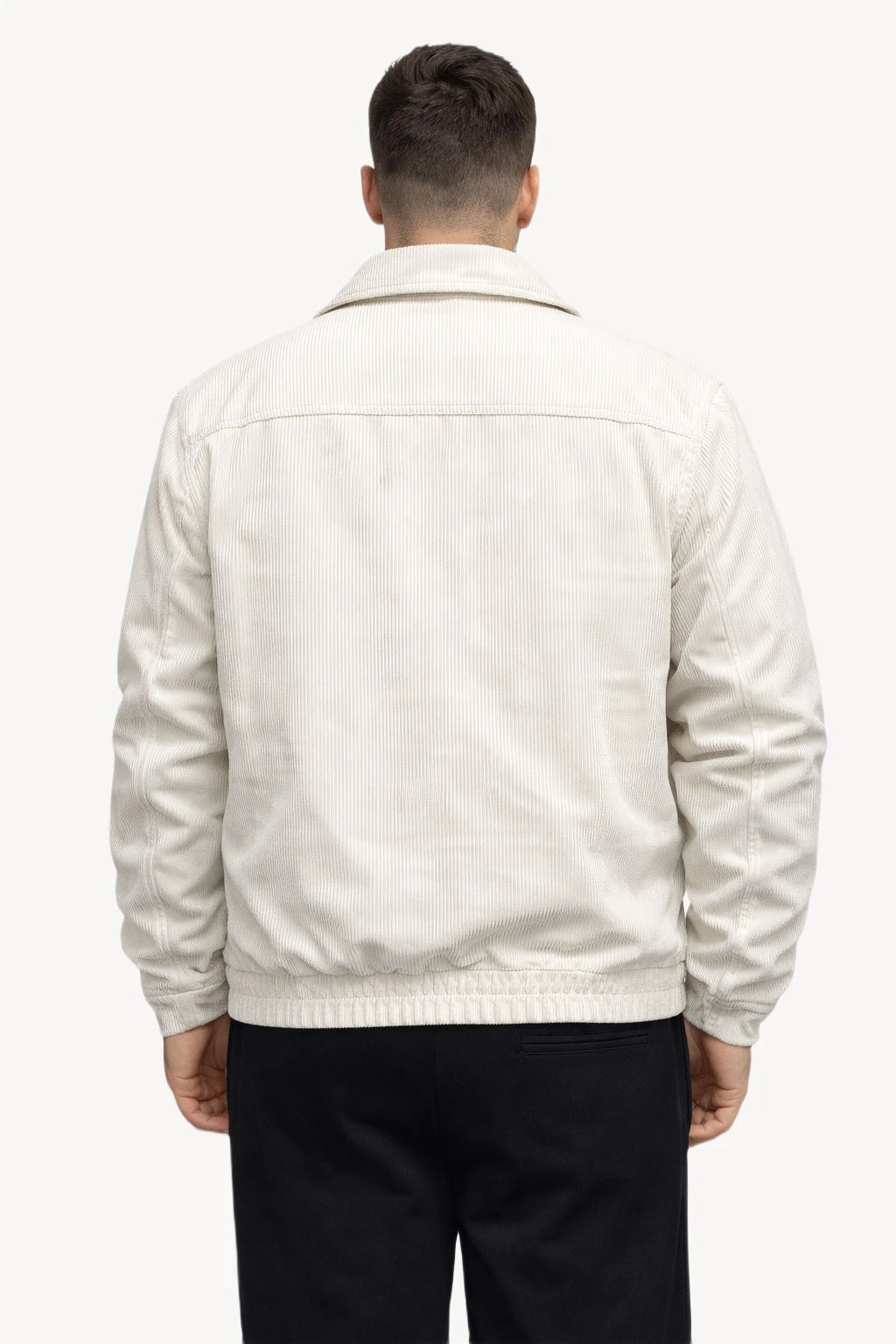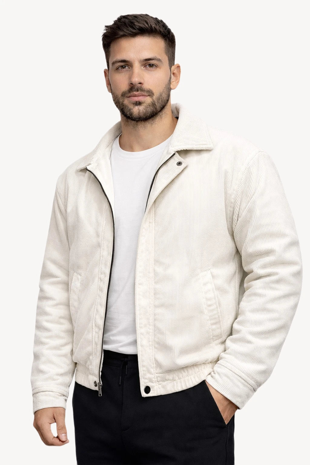 Modern şehir stilini klasik dokularla buluşturan bu beyaz erkek mont, fitilli kadife yüzeyiyle sade ama karakterli bir görünüm sunar. Düz ve desensiz yapısı sayesinde zamansız bir stil oluştururken, açık rengiyle kombinlerde ferah ve net bir etki yaratır.