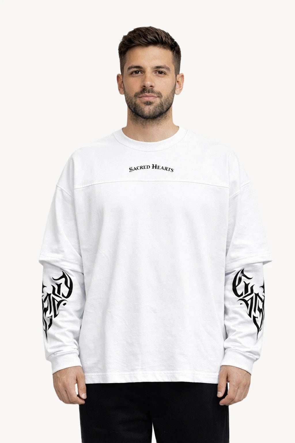 Temiz beyaz zemin üzerine konumlandırılmış Sacred Hearts tipografisi ve grafik detaylarıyla öne çıkan bu uzun kollu t-shirt, sade görünümünü güçlü bir karakterle tamamlar. Göğüs kısmındaki minimal Sacred Hearts yazısı tasarıma dengeli bir odak noktası kazandırırken; sırt bölümündeki banner formundaki Sacred Hearts baskı tasarımı net bir imza niteliği taşır.